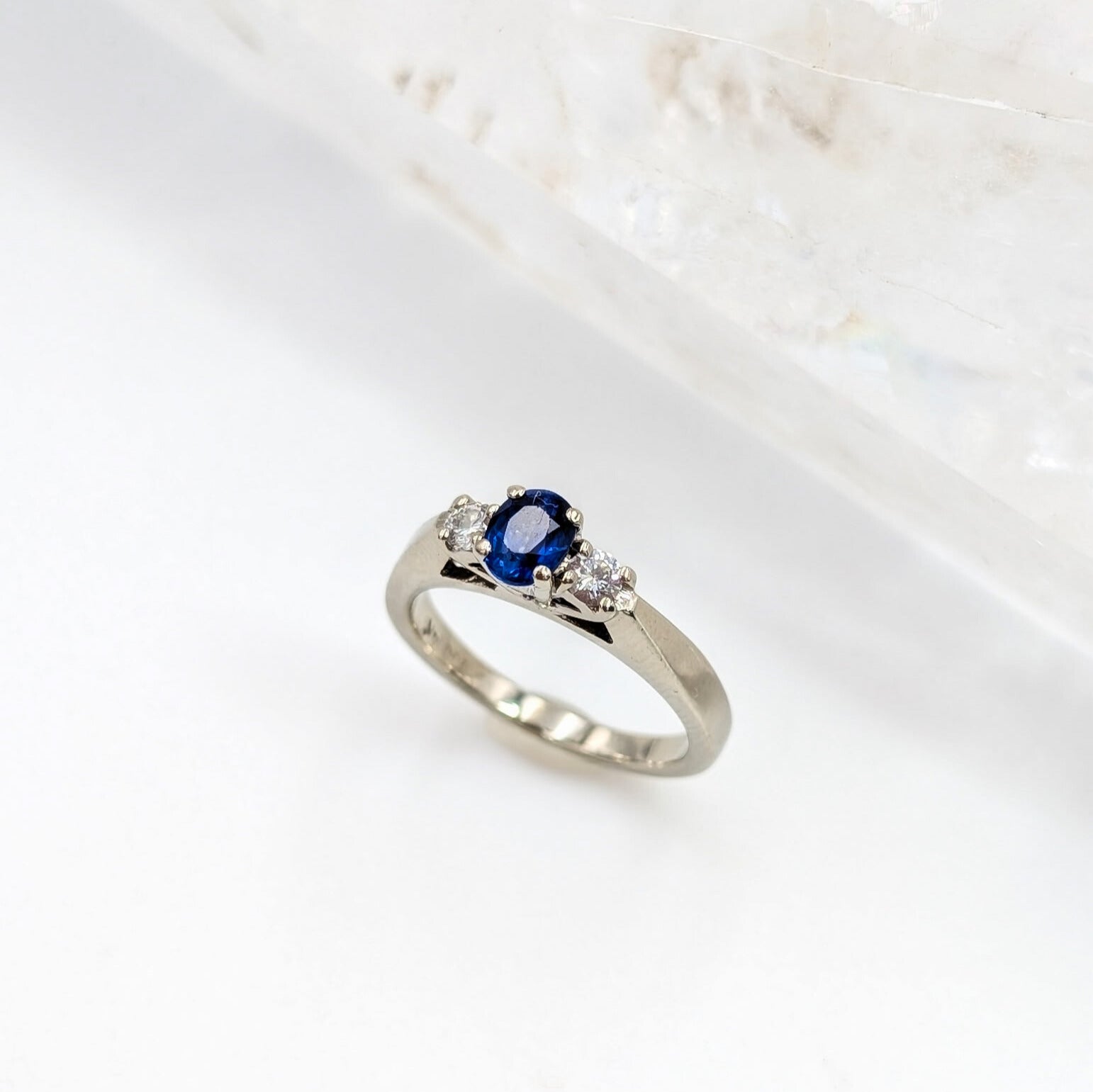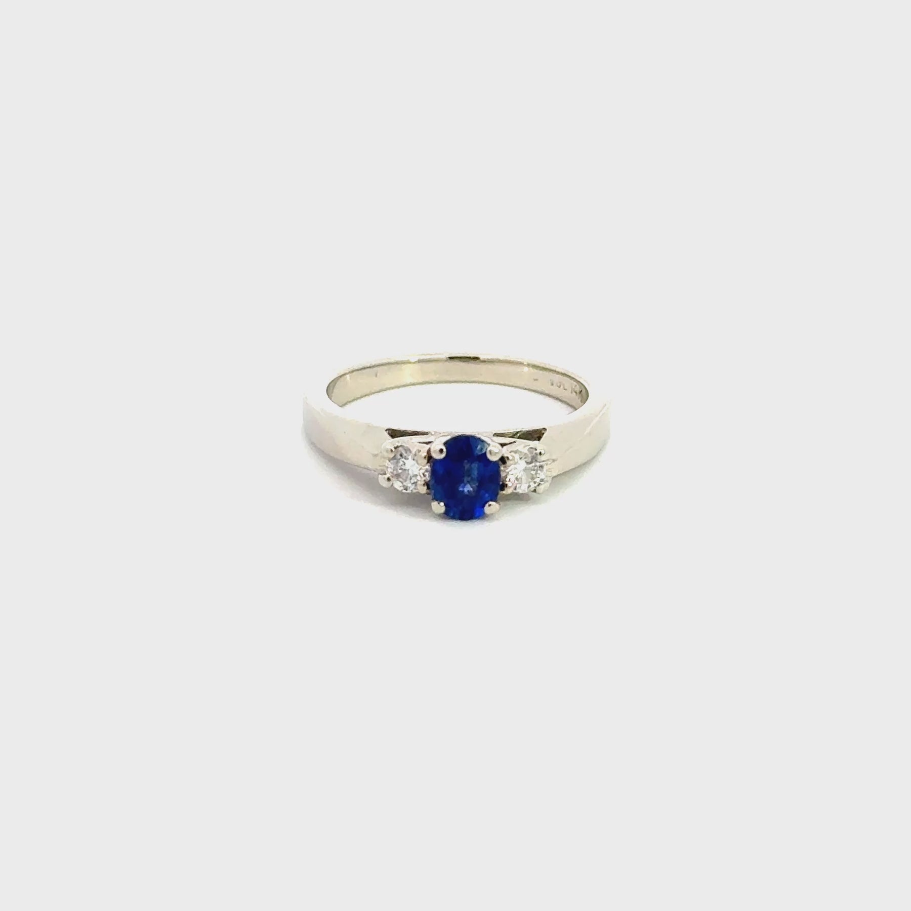 This timeless ring showcases a captivating oval-cut Blue Sapphire at its center, flanked by two sparkling round Diamonds that enhance its brilliance. Crafted in solid 14K White Gold, the sleek, polished setting balances modern elegance with classic sophistication.