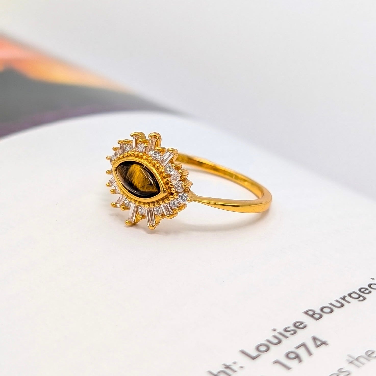 Crafted in 18K Gold-plated Sterling Silver, this striking ring embodies timeless elegance and thoughtful artisanal craftsmanship. A richly colored Tiger’s Eye gemstone forms the focal point of the design, framed by brilliant Cubic Zirconia accents that add contrast, depth, and refined sparkle.