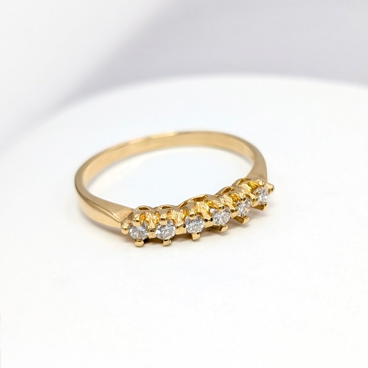 Delicate yet timeless, this ring offers classic sparkle with vintage charm. Its slim gold band makes it perfect for stacking, wearing as a wedding band, anniversary ring, or as a meaningful everyday piece.
