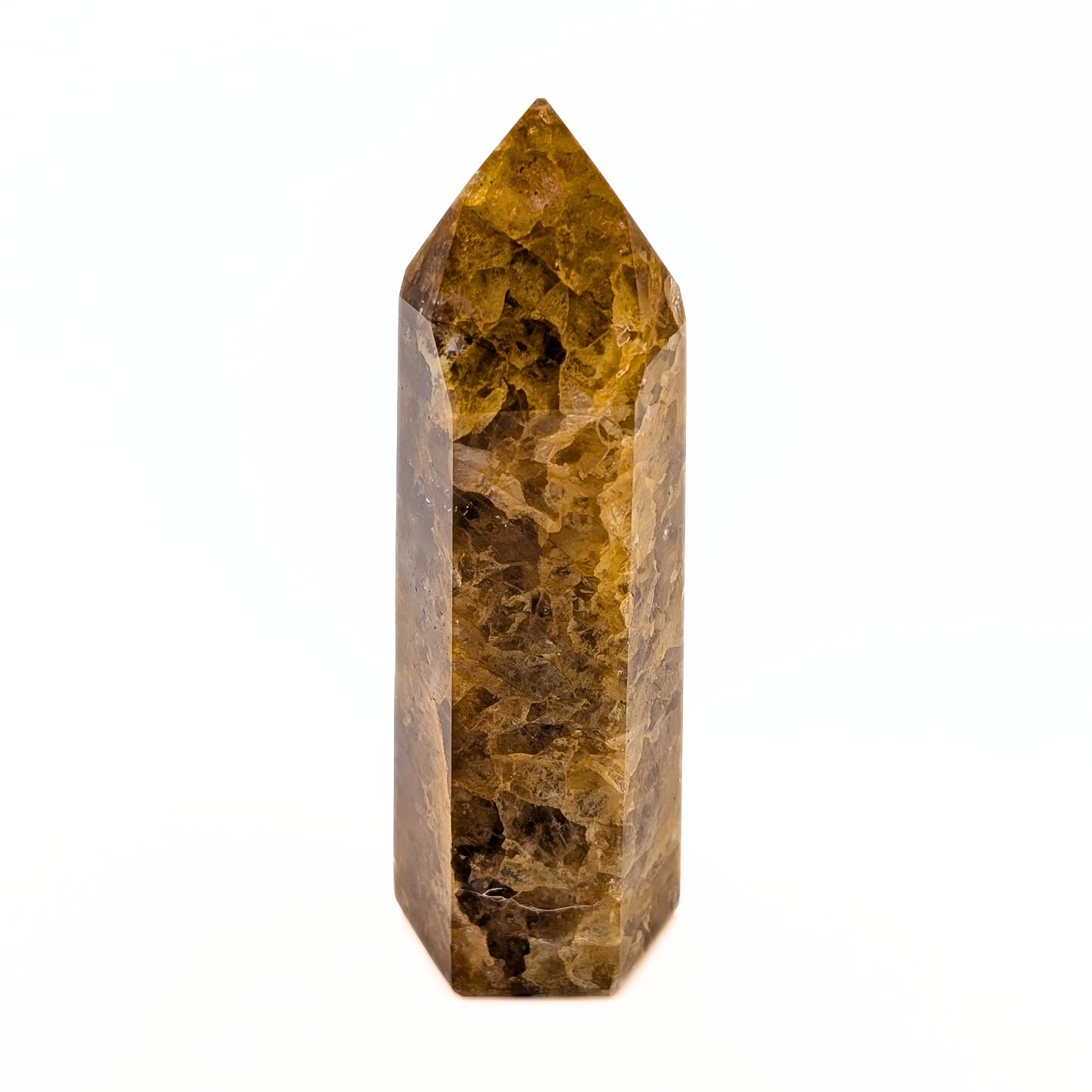 This Golden Healer Quartz polished tower features rich honey and caramel tones with natural patterns and inclusions that give it depth and character from every angle. The smooth facets and sharp point draw the eye upward, making it a striking centerpiece for an altar, desk, or meditation space.