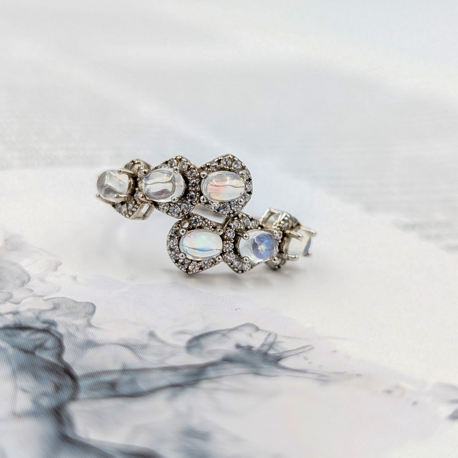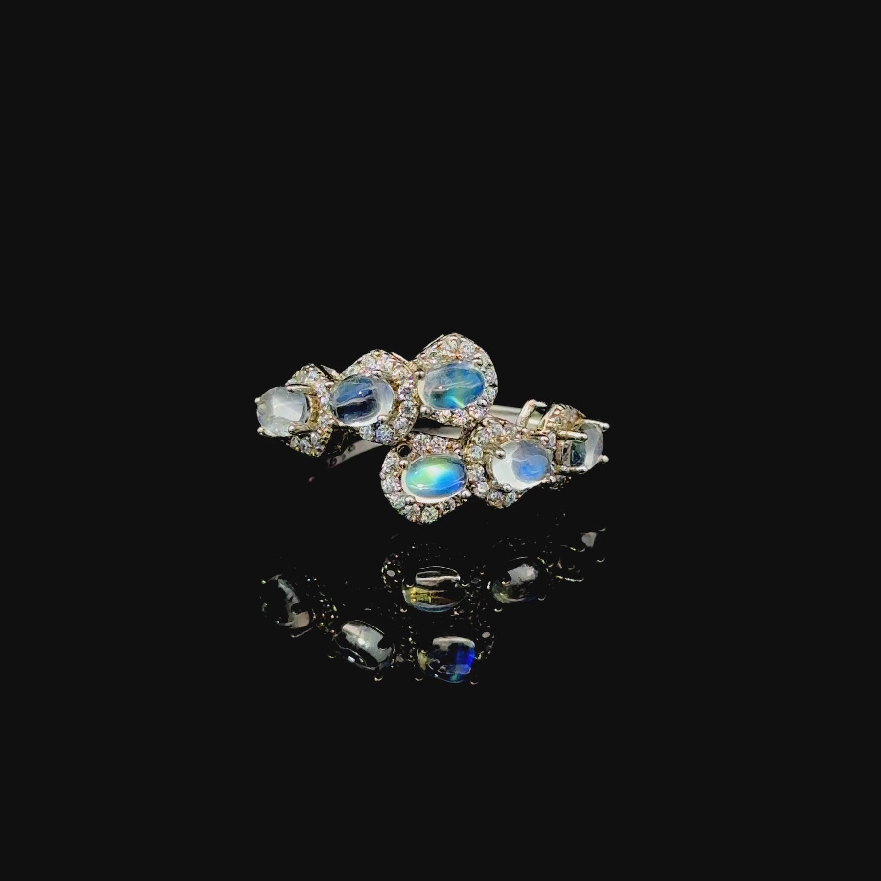 This enchanting ring showcases a cluster of natural Moonstones, each displaying soft flashes of blue and rainbow sheen that shift beautifully in the light. The luminous cabochons are framed by sparkling White Zircon accents that add refined brilliance and enhance the ethereal glow of the stones.