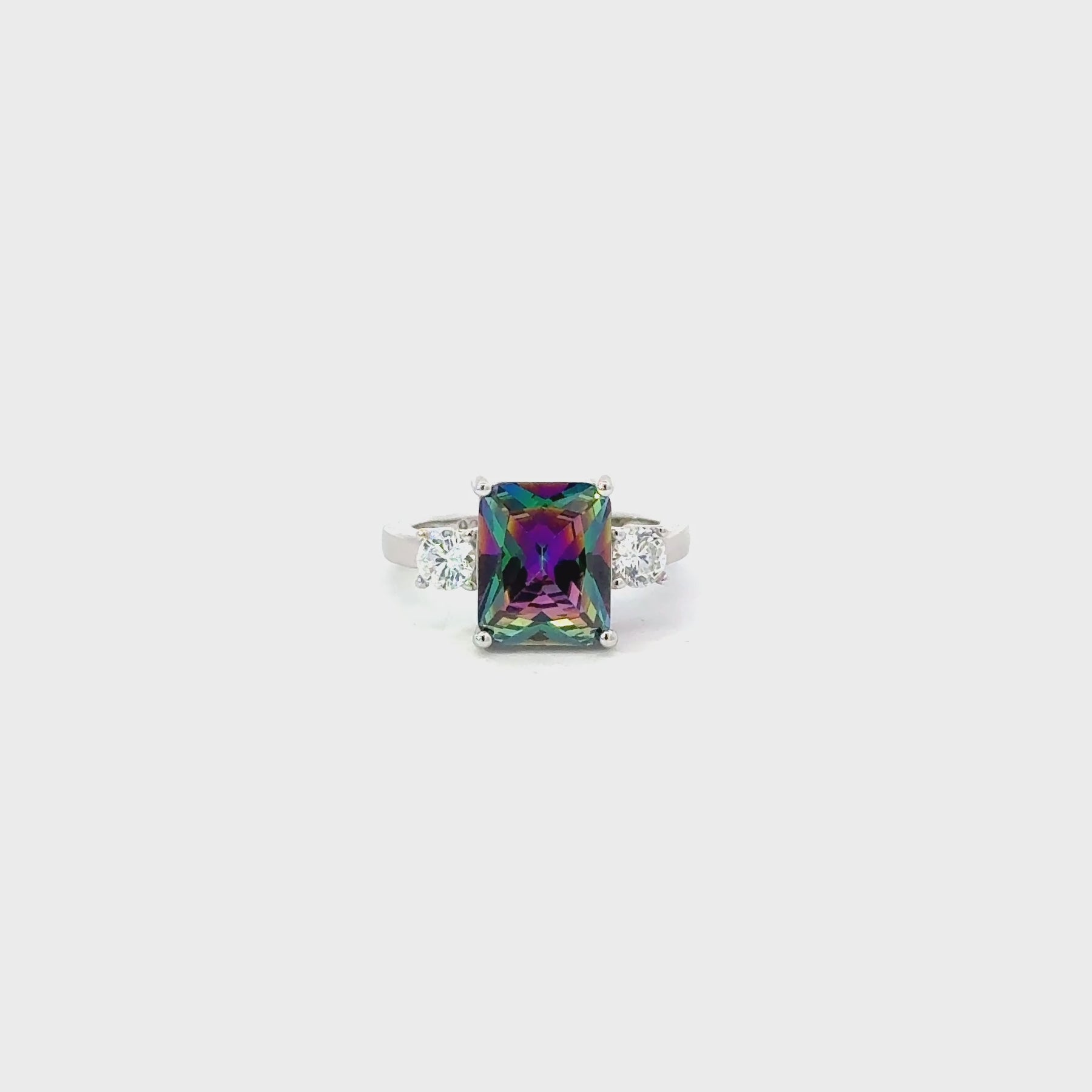 This striking ring showcases a radiant rectangular cut Mystic Topaz centerstone that displays a captivating array of colors in vivid greens, purples, and flashes of blue as it catches the light. The centerpiece is complemented by two brilliant round cut Cubic Zirconia accents, enhancing the design with balanced sparkle and refined contrast. Crafted in solid Sterling Silver, the ring features a classic prong setting that highlights the stone’s brilliance while ensuring secure placement. A timeless yet modern piece, it embodies sophistication and vibrant elegance, making it a perfect statement addition to any jewelry collection.