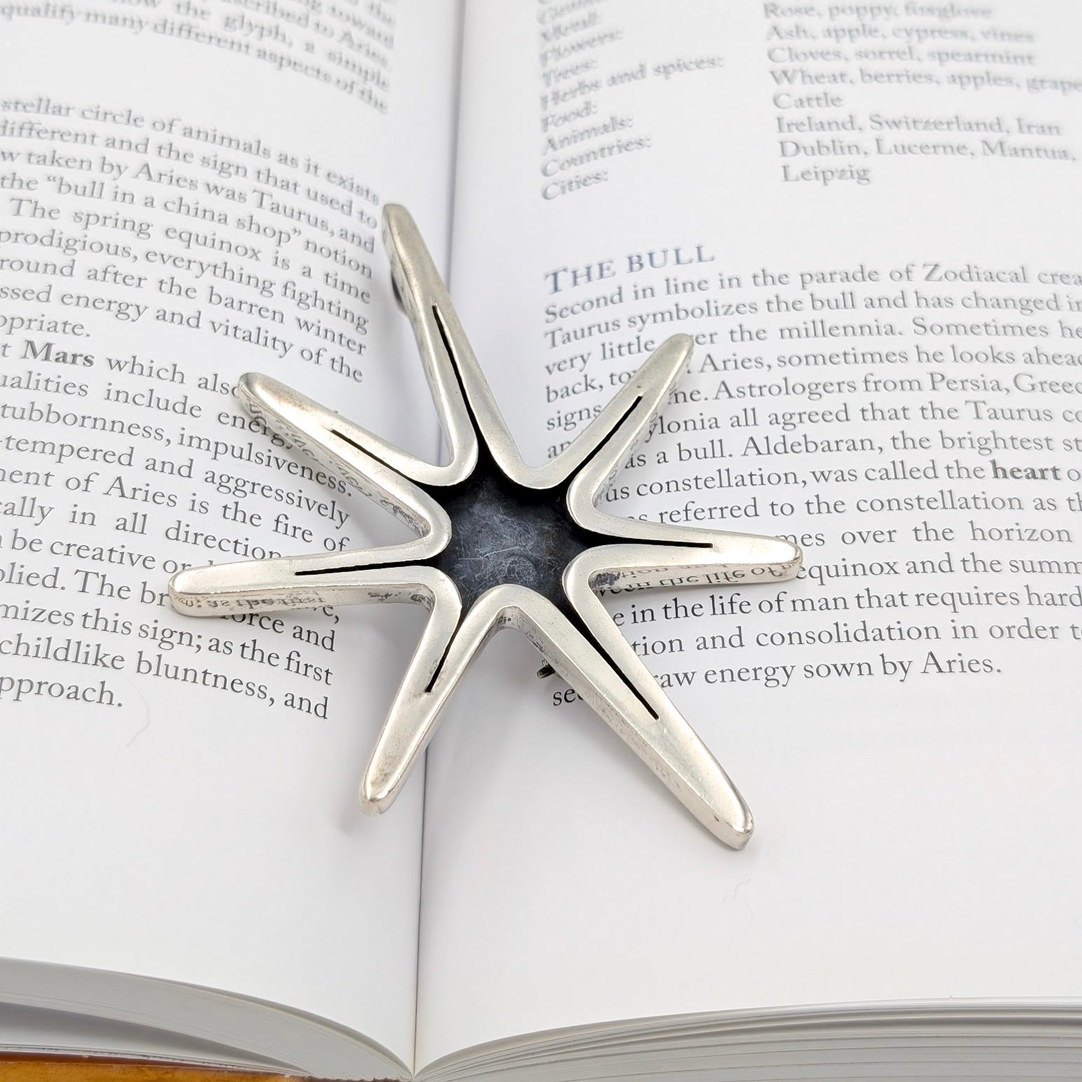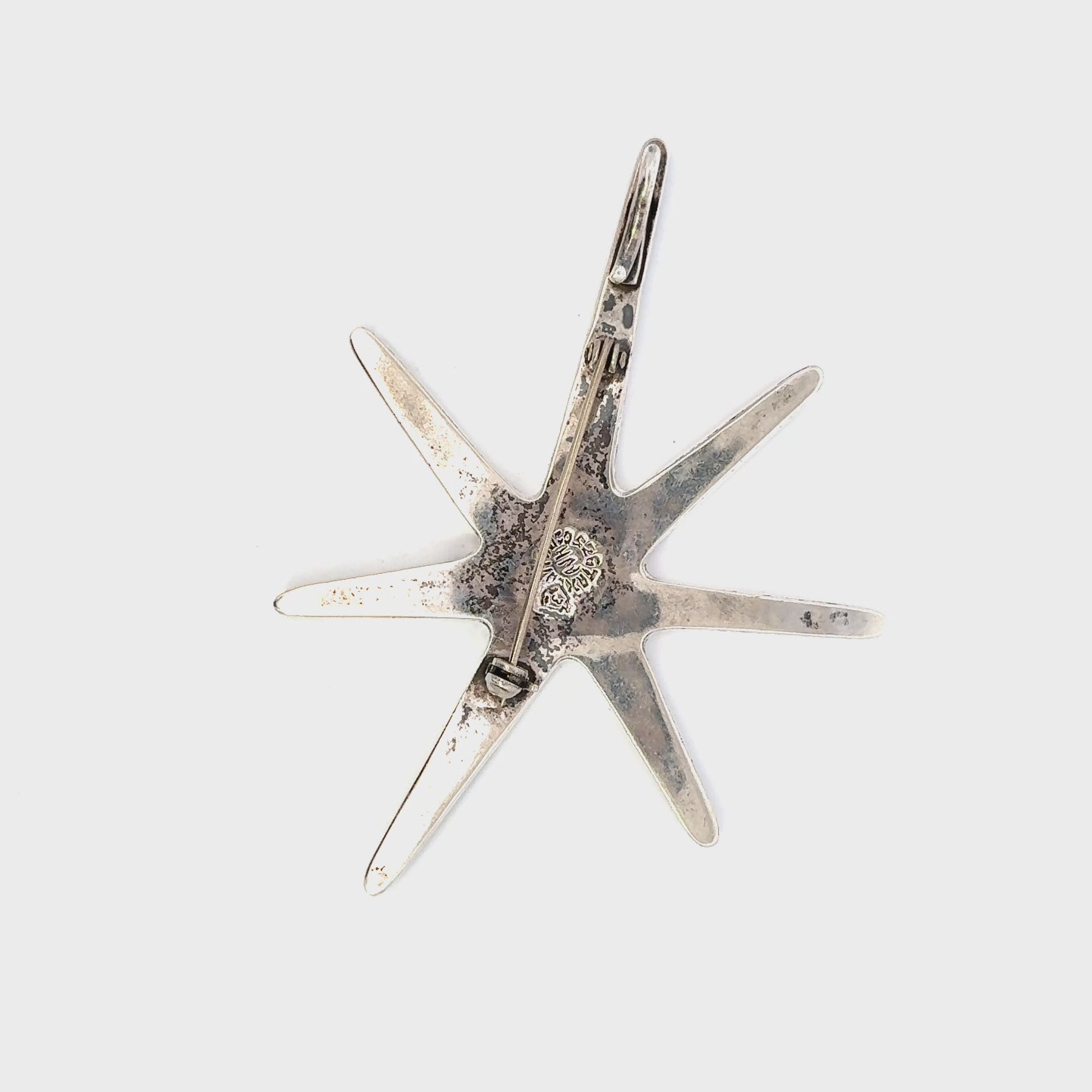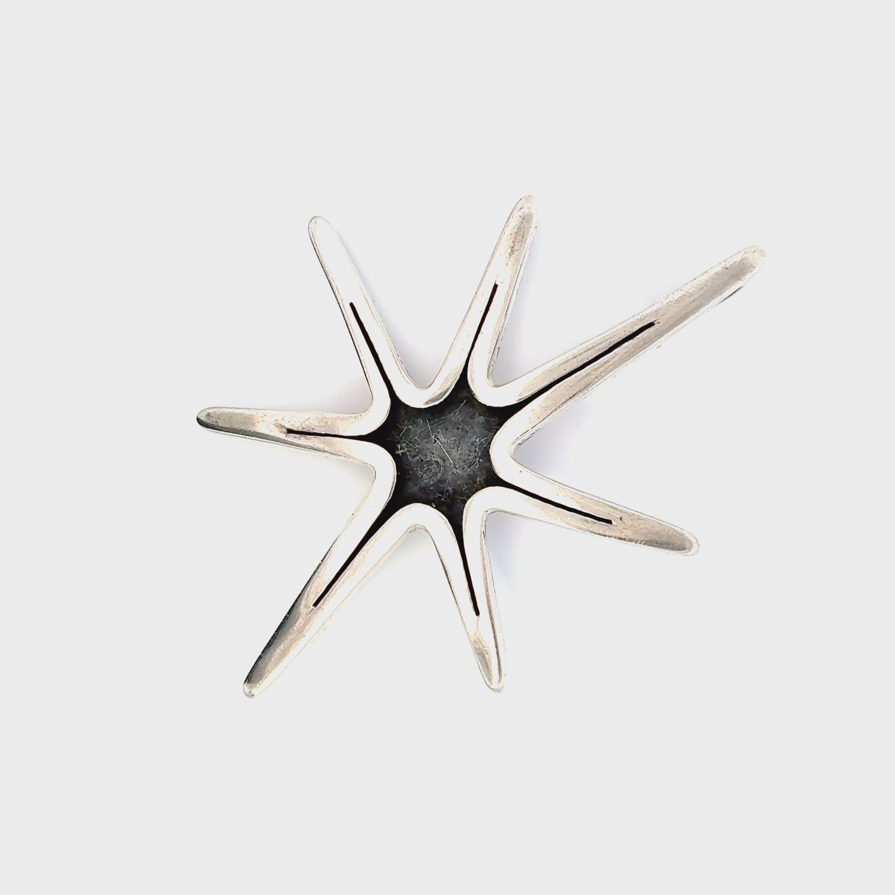 Crafted in solid Sterling Silver, it features the iconic starburst silhouette with elongated sculptural rays radiating from a contrasting center. Some original tarnish and patina have been intentionally left in place to highlight the authenticity and age of this remarkable piece, giving it rich vintage character and preserving its storied history.