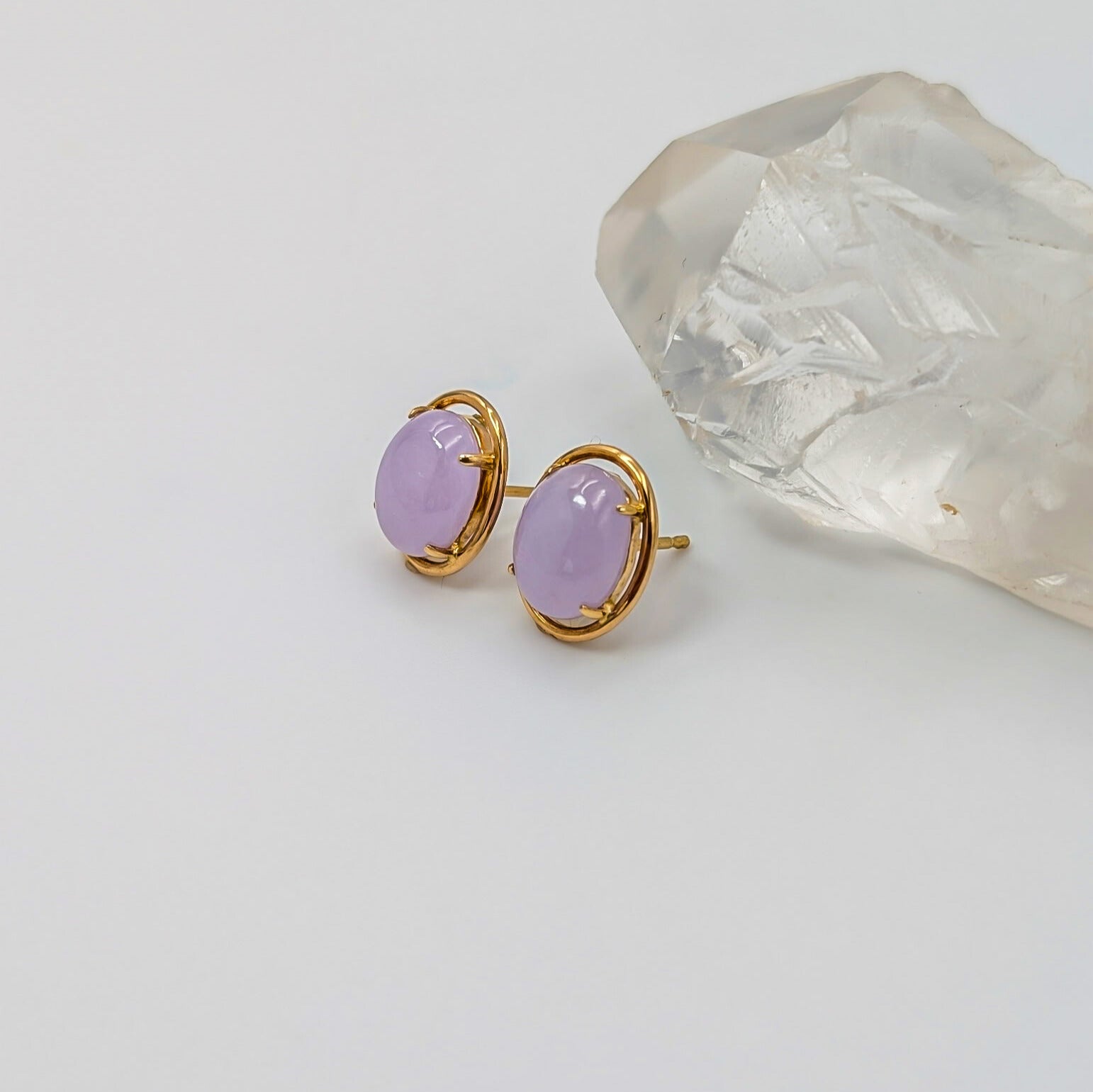 These elegant vintage earrings feature smooth oval cabochons of treated Lavender Jade set in solid 14K yellow gold. The jade displays a soft, tranquil lilac hue that radiates calm and sophistication, beautifully complemented by the warm glow of the gold setting.