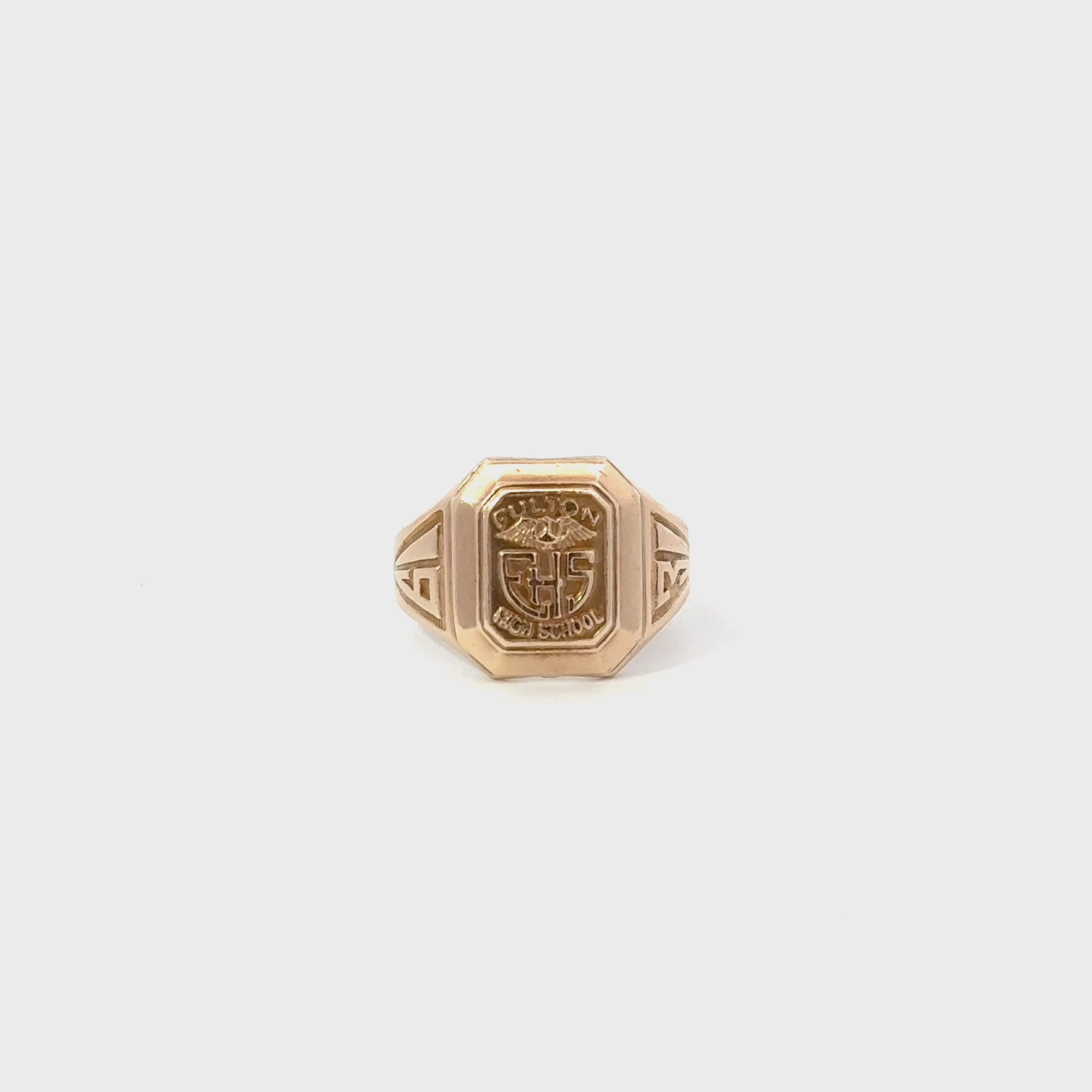 This Vintage Class Ring is crafted in solid 10K yellow gold and features a classic signet style design with detailed engraving on the face and shoulders. The center emblem displays a traditional school crest marked “FHS” for Fulton High School, framed by an octagonal border that gives the ring a strong, timeless presence.