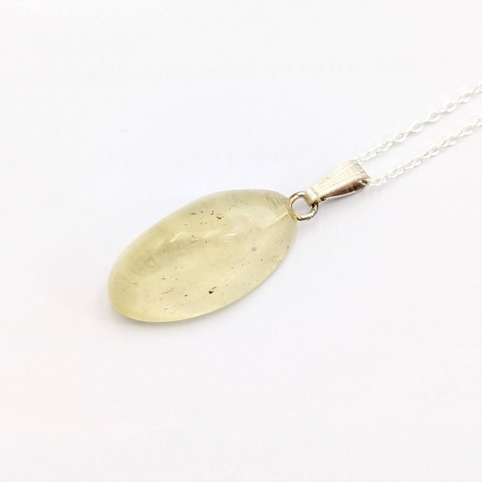 This Sterling Silver necklace features a genuine polished Libyan Desert Glass gemstone, known for its soft golden hue and natural translucence. Formed from an ancient meteorite impact in the Sahara Desert, each stone carries subtle inclusions and organic character that make every piece one of a kind.
