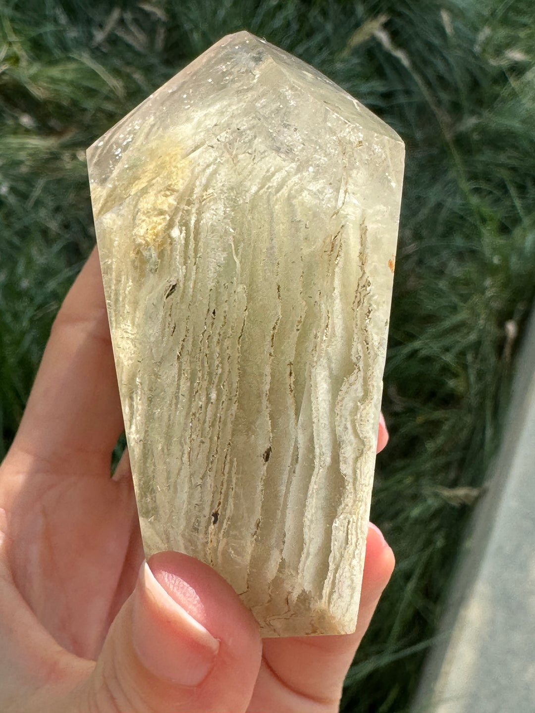 This Garden Quartz freeform measures approximately 3.5" tall and 2.5" wide at the base. Its natural inclusions create a unique, garden-like pattern, and a special feature of a natural rainbow adds a captivating sparkle.